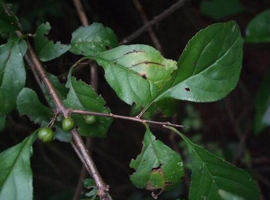 【原形态】薄叶鼠李 灌木或稀小乔木,高达5m。幼枝对生或近对生,褐色或黄褐色,平滑无毛,有光泽。叶对生或近对生;叶柄长0.8-2cm,有短柔毛;托叶线形,早落;叶片纸质,倒卵形或倒卵状椭圆形,长3-8cm,宽2-5cm,先端短急尖,基部楔形,边缘具钝锯齿,上面深绿色,无毛,下面淡绿色,仅沿脉腋有簇毛。花单性,雌雄异株,绿色,成聚伞花序或簇生于短枝端;花萼4裂;花瓣4;雄蕊4;花柱2半裂。核果球形,直径4-6mm,基部有宿存萼筒,成熟时黑色。种子宽倒卵圆形,背面具纵沟。花期3-5月,果期5-10月。