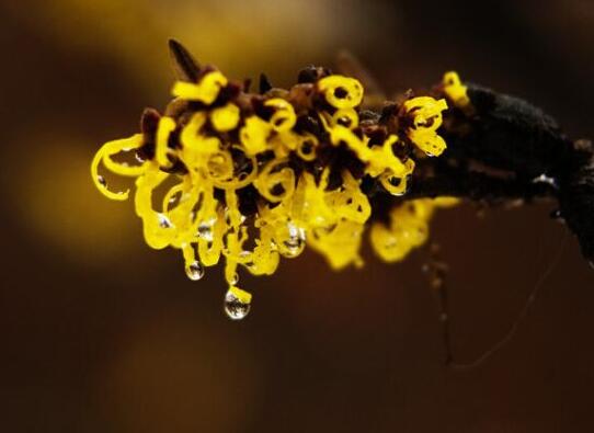 【原形态】金缕梅 落叶灌木或小乔木,高达8m;小枝幼时有星状毛。叶互生;叶柄长6-10mm,被绒毛;托叶早落;叶片纸质,宽倒卵圆形,长6-12cm,宽3-7.5cm,先端短急尖,基部心形不等,边缘有波状齿,上面淡绿色,有短毛,下面密生灰色星状绒毛,侧脉7-9对。短穗状花序腋生,具数朵花;花两性;萼简短,萼齿4,宿存,被星状毛;花瓣4,黄白色,带状,长约1.5cm;雄蕊4,与退化雄蕊互生;子房近上位,2室,花柱2,长1-1.5mm,分离。蒴果卵圆形,长1.2cm,宽1cm,密被黄褐色星状毛。种子椭圆形,长约8mm,黑色,发亮。花期5月,果熟期10月。