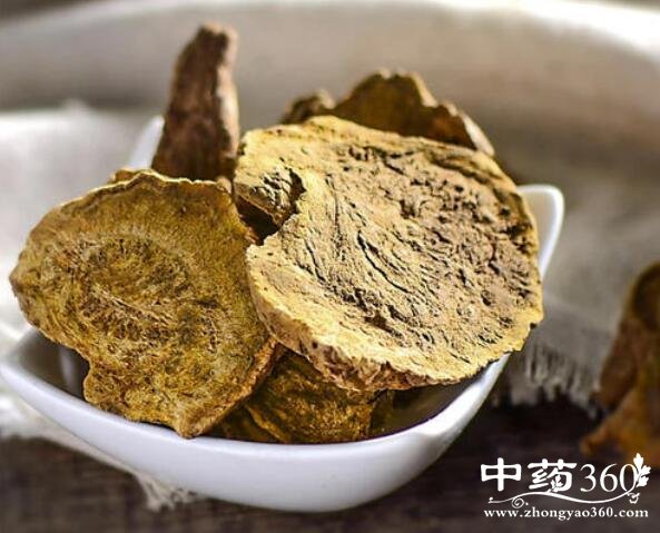 【药材性状】类圆柱形、圆锥形、卵圆形或不规则块状,长3~ 17厘米,直径3~ 10厘米。除尽外皮者表面黄棕色至红棕色,有的可见类白色网状纹理及星点(异型维管束)散在,残留的外皮棕褐色,多具绳孔及粗皱纹。质坚实,有的中心稍松软,断面淡红棕色或黄棕色,显颗粒性;根茎髓部宽广,有星点环列或散在;根木部发达,具放射状纹理,形成层环明显,无星点。气清香,味苦而微涩,嚼之粘牙,有沙粒感。