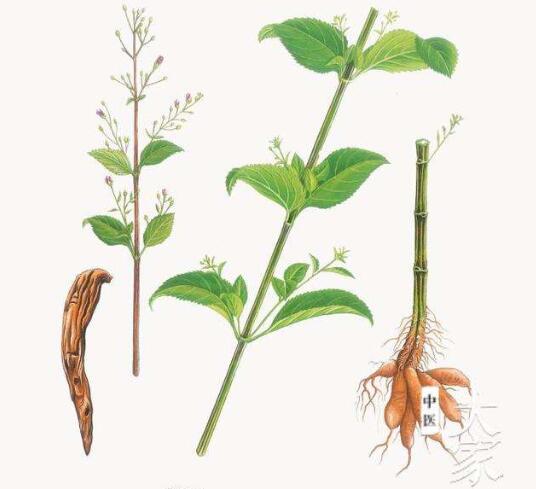 【药材性状】须根细小,茎略呈方柱形,节稍膨大,多分枝,长30~80厘米,直径1.5~2.5毫米,黄绿色,老茎略带紫色;折断面纤维性,髓部中空。单叶对生,多皱缩,完整者展平后呈卵形或卵圆形,长3~5厘米,宽2~3厘米,黄绿色至灰绿色;先端锐尖,基部楔形,边缘有圆钝锯齿。叶柄长1~2厘米。全体被短糙毛。总状花序顶生或腋生,花萼裂片4,外2片较大,卵圆形,内2片细小,条形;花冠唇形。蒴果扁卵形,包于宿存的萼片内。种子细小,多数。气微,味苦。