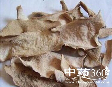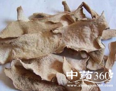 外观呈类圆形或长圆形块片,表面黄棕色或淡棕色,直径约4—7厘米,厚0.5—3厘米,偶而有厚达7厘米者。外栓皮呈重叠的薄片状,易剥落而露出黄色皮部;切面不平坦,有暗棕色与黄白色相间的明显同心环,质轻,易折断,断面有粉性,水湿后有黏性,撕开时可见黏丝;闻之气微,口尝味甘,并有刺激性辣味。