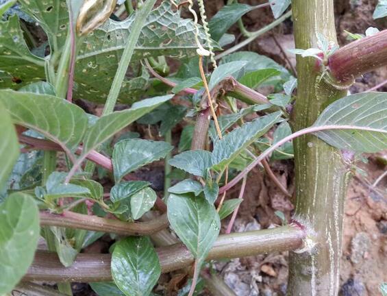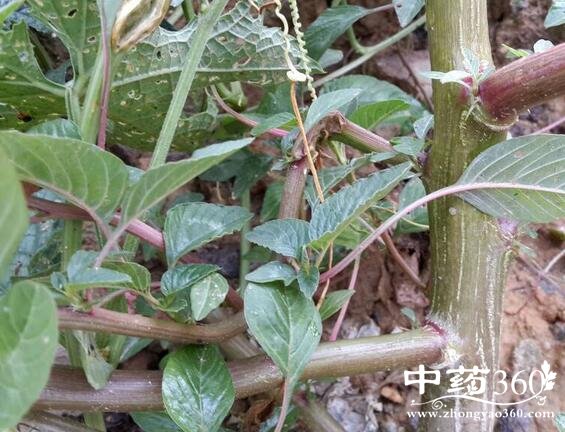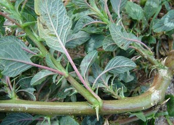 性状鉴别 主根长圆锥形,有的具分枝,稍木质。茎圆柱形,多分枝,棕红色或棕绿色。叶互生,叶片皱缩,展平后呈卵形或菱状卵形,长4-10cm,宽1-3cm,先端有细刺,全缘或微波状;叶柄与叶片等长或稍短,叶腋有坚刺1对。雄花集成顶生圆锥花序,雌花簇生于叶腋。胞果近卵形,盖裂。气微,味淡。