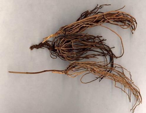 本品全长30~80cm,常将10数株地上茎折绕成小把。根茎呈不规则柱状,有盘节,长0.5~3.5cm,直径2~4mm。根丛生成须状,着生于根茎周围,呈细长圆柱形,弯曲,长10~16cm,直径1~1.5mm,表面灰黄色、棕黄色至淡棕褐色,有细微的纵皱纹,常旁生纤细的须根;质脆,折断面粉性,皮部类白色或黄白色,靠近形成层处有淡棕色的环,中央有细小黄色木部;存放后可见析出闪亮的小结晶。地上茎圆柱形,单一,极少分枝,通常长20~40cm,间有长达70cm,直径2~3mm,少数5mm,有细纵棱沟,灰青色;质硬脆,断面中空。叶对生于茎节上,相距较远,叶片线状披针形,青绿色,长4~10cm,宽0.3~1.5cm,无毛或有稀疏的柔毛,全缘而稍反卷,具短缘毛。顶生的花序少见。气香,根部尤显著,味微辛凉。