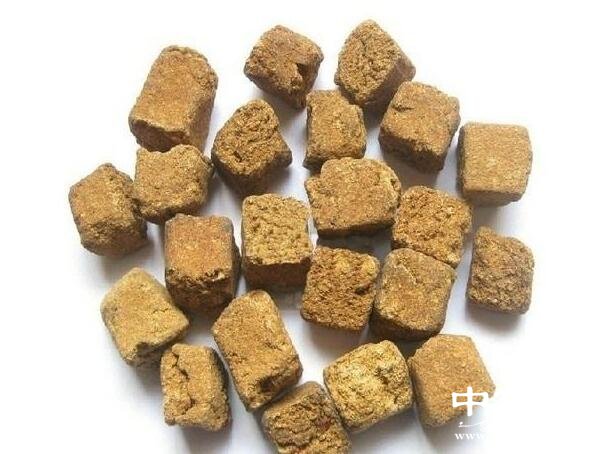 【药材性状】本品呈方形或长方形的块状,直径约3厘米,厚约1厘米,外表土黄色,粗糙。质硬脆,易断,断面不平整,类白色,可见未被粉碎的褐色残渣及发酵后的空隙。具陈腐气,味苦。以身干、陈久、无虫蛀、杂质少者为佳。