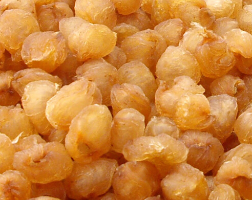 龙眼肉表面呈黄棕色,半透明,靠近果皮的一面皱缩不平,粗糙,靠近种皮的一面,光亮而有纵皱纹。它的质柔软而微有粘性,常粘结呈块状。