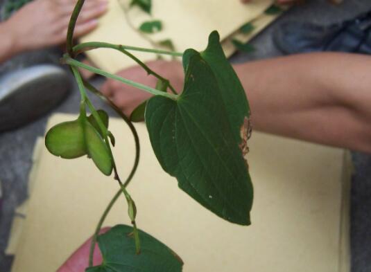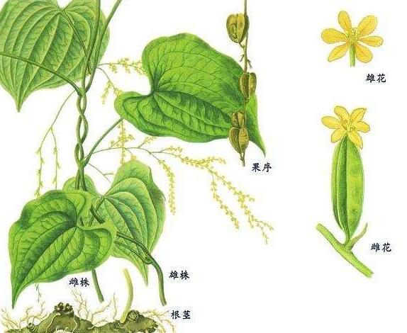 【植物形态】多年生缠绕性藤本,根状茎横走,粗厚。茎纤细,左旋,圆锥形。单叶互生;叶片卵形,先端渐尖,边缘微波状,叶干后不变黑。花雌雄异株;雄花序腋生,为直立的圆锥花序,花橙黄色,疏生,单生或间为2朵对生,花瓣6,开展,长圆形,雄蕊6,与花瓣对生,其中3枚较大;雌花序腋生,为下垂的圆锥花序。蒴果宽倒卵形,疏生,具3翅,干后棕褐色。花期6—8月,果期7~10月。