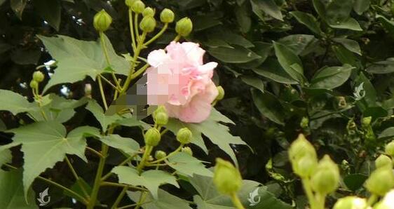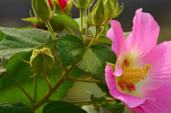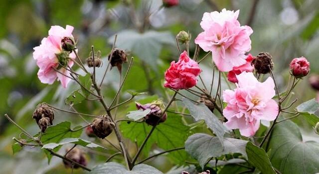 植物形态】落叶灌木或小乔木。树皮灰白色,茎有星状毛及短柔毛。叶互生,宽卵圆状心形,花单生枝端叶腋,小苞片8,线形;萼钟形,5裂,裂片卵状三角形,苞片及萼片密生黄褐色茸毛;花瓣5或重瓣,宽倒卵圆形,初开时白色或淡红色,后变深红色,花径8厘米;单体雄蕊;雌蕊1枚,子房5室,柱头5裂。蒴果扁球形,直径约2.5厘米,生黄色刚毛及绵毛,果瓣5。种子多数,肾形。花期8~10月,果期9~11月。