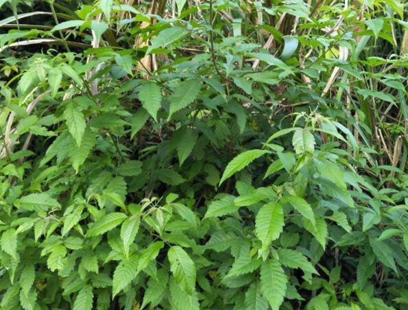 药材性状】多干缩成团。展开后小叶5片或3片,披针形,中间小叶片长5~10厘米,宽2~4厘米,两侧小叶依次渐小,先端渐尖,基部楔形,边缘锯齿状,上表面绿色,下表面浅绿色,上、下表面有少量毛,沿叶脉有短茸毛。搓碎后气清香,味辛微苦。