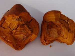 【药材性状】卵形、类球形、三角形或四方形,大小不一,直径0.6~3厘米,少数呈管状或碎片。表面红黄色至棕黄色,有的表面挂有一层黑色光亮的薄膜,习称“乌金衣”,有的粗糙,具疣状突起,有的具龟裂纹。体轻,质酥脆,易分层剥落,断面金黄色,可见细密同心层纹,有的夹有白心。气清香,味苦而后甘,有清凉感。嚼之易碎,不粘牙。水液能将指甲染成黄色,习称“挂甲”。