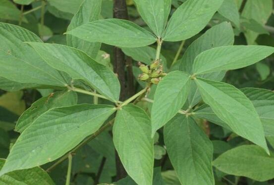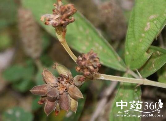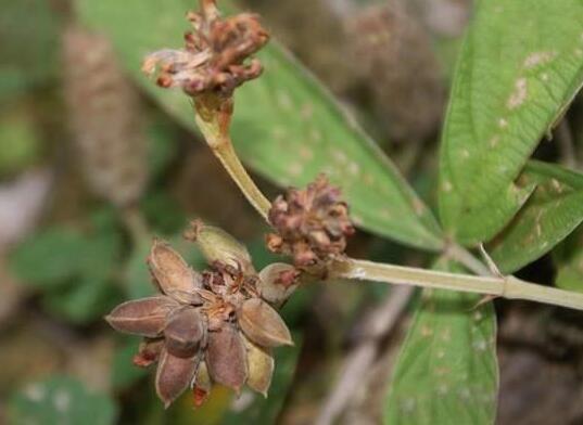 【植物形态】:直立或披散亚灌木。幼枝三棱柱状,密被灰褐色短柔毛。叶具指状3小叶;托叶线状披针形,长约0.6-1厘米,有纵纹,被毛,先端细尖,宿存;叶柄长2-2.5厘米;小叶厚纸质,长椭圆形或卵状披针形,偏斜长4-7(-9)厘米,宽1.7-3厘米,先端钝,有时有小凸尖,基部圆形,上面被疏短柔毛,背面密被灰褐色柔毛;基出脉3,侧脉及网脉在上面多少凹陷,下面凸起,侧生小叶略小;小叶柄极短,密被短柔毛。总状花序腋生,通常长2-2.5厘米,各部密被灰褐色至灰白色柔毛;苞片狭卵状披针形;花密生,具短梗;萼裂片披针形,远较萼管长,被灰白色长伏毛;花冠紫红色,约与花萼等长,旗瓣长圆形,基部具极短瓣柄,两侧具不明显的耳,翼瓣镰状,基部具瓣柄及一侧具微耳,龙骨瓣椭圆状,略弯,基部具瓣柄,一侧具1尖耳;雄蕊二体;子房被毛。荚果椭圆状,长7-8毫米,宽约5毫米,被短柔毛;种子2颗,近圆球形,黑色。花、果期夏秋季。