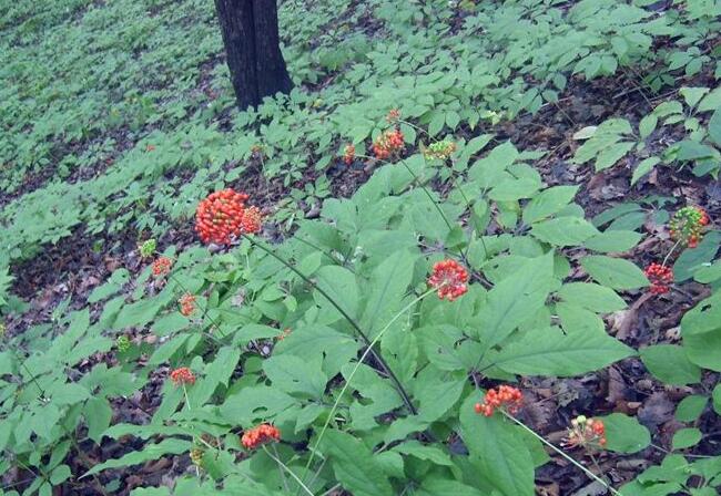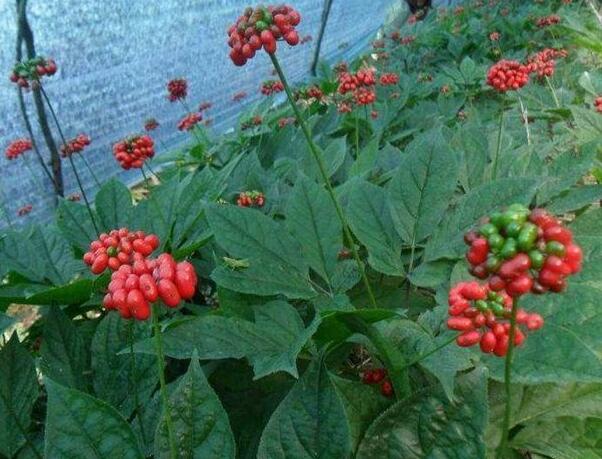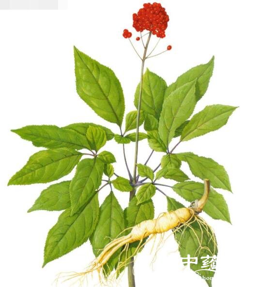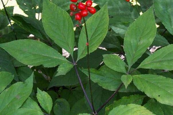 【原形态】多年生草本,高30-70cm。根肥大,肉质,圆柱或纺锤形,末端多分歧,外皮淡黄色。叶为掌状复叶,具长柄;轮生叶的数目依生长年限而不同,一般1年生者1片三出复叶,2年复叶,最多可达6片复叶;小叶5,偶有7片,小叶柄长1-3cm;小叶片披针形或卵形,下方2片小叶较小,长2-4cm,宽1-1.5cm,上部3小叶长4.5-15cm,宽2.2-4cm,先端渐尖,基部楔形,边缘具细锯齿,上面绿色,沿叶脉有稀疏细刚毛,下面无毛。伞形花序单一顶生,总花梗长15-25cm,每花序有10-80多朵花,集成圆球形;花小,直径2-3mm;花萼绿色,5齿裂;花瓣5,淡黄绿色,卵形;雄蕊5,花丝甚短;子房下位,花柱2,基部合生,上部分离。果实为核果状浆果,扁球形,直径5-9mm,多数,集成头状,成熟时呈鲜红色,种子2颗,乳白色,直径4-5mm,扁平圆卵形,一侧平截。花期5-6月,果期6-9月。