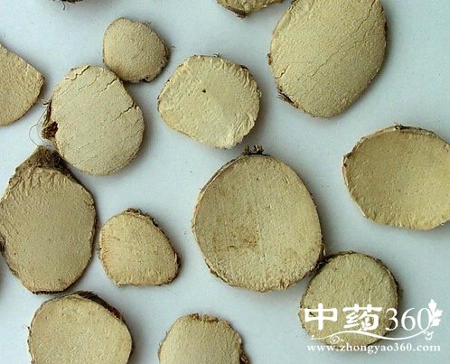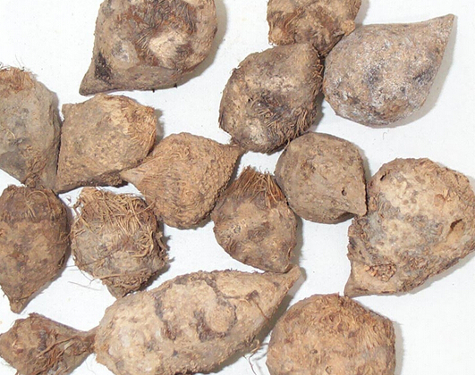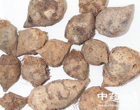 【性状】本品呈圆锥形,略扁,长2~6cm,直径2~4cm。表面黄白色或灰黄色,有刀削痕,须根痕小点状,略呈横向环状排列。体重,质坚实。无臭,味淡,嚼之微有麻辣感。