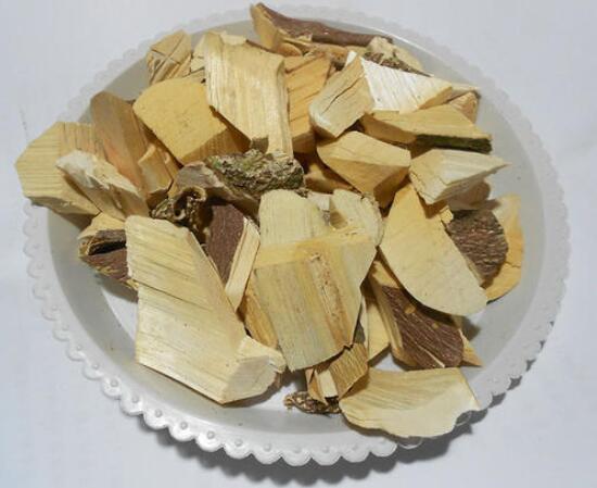 【药材性状】枝叶多已切成碎块。茎皮表面灰青色,间有白皮斑,皮部易脱落,木部白色,致密细结。茎枝断面中央有白色的髓,具油臆(哈喇、败油)气,味苦。完整叶片展平后呈3出指状复叶,具长柄;小叶纸质,先端长尖,基部渐窄下延成小叶柄,全缘或不规则微波状,叶上表面黄绿色,光滑,可见小油点,叶下表面颜色较浅。揉之有香气,味极苦。