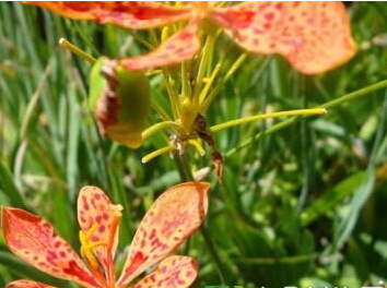 射干 多年生草本。根茎粗壮,横生,鲜黄色,呈不规则的结节状,着生多数细长的须根。茎直立,高50-150cm,实心,下部生叶。叶互生,扁平,宽剑形,对折,互相嵌叠,排成2列,长20-60cm,宽 2-4cm,先端渐尖,基部抱茎,全线,绿色带白粉;叶脉数条,平行。聚伞花序伞房状顶生,2叉状分枝,技端着生数花,花梗及分枝基部均有膜质苞片;苞片披针形至狭卵形;花被片6,2轮,外轮花被裂片倒卵形或长椭圆形,长约2.Scm,宽1cm,内轮3片略小,倒卵形或长椭圆形,长2-2.5cm,宽1cm,橘黄色,有暗红色斑点;雄蕊3,贴生于外花被片基部,花药外向;雌蕊1,子房下位,3室,中轮胎座,柱头3浅裂。葫果倒卵形或长椭圆形,长2-4cm,具3纵棱,成熟时室背开裂,果瓣向外弯曲。种子多数,近圆形,黑紫色,有光泽,直径约5mm。花期6-8月,果期7-9月。