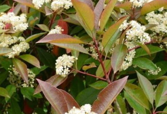 【植物形态】常绿灌木或小乔木,高4~6米,有时可达12米。小枝褐灰色,无毛。叶互生;叶柄粗壮,长2~4厘米,老时无毛;叶片革质,长椭圆形、长倒卵形或倒卵状椭圆形,长9~22厘米,宽3~6.5厘米,先端尾尖,基部圆形或宽楔形,边缘有疏生具腺细锯齿,近基部全缘,上面光亮,幼时中脉有绒毛,成熟后两面皆无毛。叶片形变异较大,幼苗期锯齿有针刺。花两性;复伞房花序顶生,总花梗和花梗无毛;花梗长3~5毫米;花密生,直径6~8毫米;萼筒杯状,长约1毫米;萼片5,阔三角形,长约1毫米,先端急尖;花瓣5,白色,近圆形,直径3~4毫米:雄蕊20,外轮较花瓣长,内轮较花瓣短,花药带紫色;花柱2,有时为3,基部合生,柱头头状,子房先端有柔毛。梨果球形,直径5~6毫米,红色,鲜艳著目,后成褐紫色。种子1颗,卵形,长2毫米,棕色,平滑。花期4~5月,果期10月。