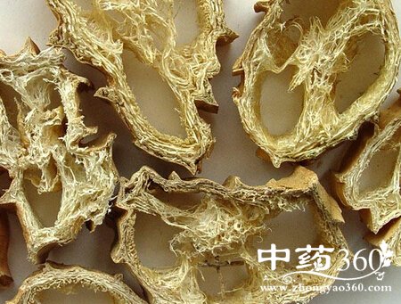 【性状】药材为丝状维管束交织而成,多呈长棱形或长圆筒形,略弯曲,长30—70cm,直径7—10cm。表面淡黄白色。体轻,质韧,有弹性,不能折断。横切面可见子房3室,呈空洞状。气微,味淡。