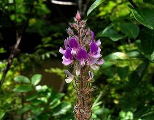 【原形态】长穗猫尾草 直立亚灌木,高l-1.5m。茎多分枝,被短柔毛。奇数羽状复叶,互生;有长柄;小叶3-7片,对生,叶片卵状披针形或椭圆形,长10-15cm,宽5-7cm,先端短尖,基部圆形或稍心形,全缘,上面无毛,背面被柔毛;托叶小。总状花序顶生,成穗状,长达30cm以上,先端弯曲,形似“狗尾”,花极稠密;萼管极短;花冠蝶形,紫色,旗瓣阔,翼瓣和龙骨瓣粘贴;雄蕊二体,于房上位。荚果2-4节,扭曲重叠,略被短毛。种子黑褐色,有光泽。花期5-7月,果期7-9月。