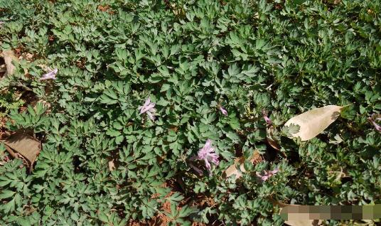 五味草 一年生草本,高12-40cm,无毛。主根长直。茎直立或铺散,自下部分枝。基生叶数枚;叶柄长6-15cm;叶片轮廓宽卵形,长2-5cm,二回三出全裂,一回裂片具短柄,末回裂片菱状宽卵形至卵状矩圆形,长2-3cm,宽1.5-2cm,再2-3深裂,小裂片常倒卵形,先端钝圆;茎生叶小与基生叶同形。总状花序顶生,疏生花数朵至10余朵;苞片下部者宽卵形,3深裂,往上刚裂浅至全缘;花梗较苞片略长,为10-25mm;萼片小,心状卵形;花冠紫红色,长15-20mm,距狭圆锥形,长占外轮上花瓣全长的1/2,末端钝圆,微下弯;蜜腺贯距不到一半。蒴果条形,长15-20mm,直径约1.6mm。种子肾圆形,黑色,有光泽。