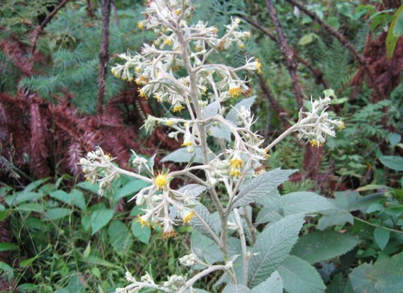花托平,无毛片;花少数;雌花舌状,白以或有时淡红色;舌片宽卵状长圆形,长约1.5mm,宽约1mm,近全缘或先具5钝齿;两性花筒状,先端有5齿裂;花药长椭圆形,先端的三角形附片。瘦果,长椭圆形,长3.5-4mm,褐色,具3条翅棱,翅缘有细齿,无冠毛。花、果期8-9月。