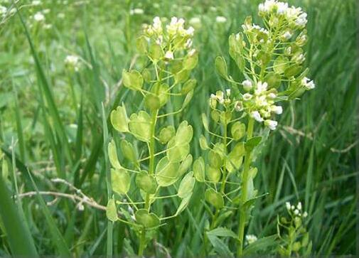 【植物形态】一年生草本,高20~40厘米,全株光滑无毛。茎直立,有分枝,表面粉绿色。单叶互生,基生叶有短柄,茎生叶无柄,基部抱茎,叶片椭圆形、倒卵形或披针形,先端尖,基部箭形,边缘具稀疏浅齿或粗齿,两面粉绿色。总状花序腋生及顶生,花萼4,卵形,绿色,边缘白色膜质,花瓣4,白色,雄蕊6,4强,花药卵形,雌蕊1,子房卵圆形而扁,先端微凹,绿色,2室。短角果扁平,卵圆形,具宽翅,先端深裂,熟时淡黄色,种子小,卵圆形而扁。花期4~7月。果期5~8月。