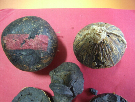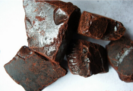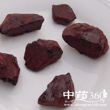 原装血竭:呈扁圆形,四方形或不规则块状物,大小不等。表面铁黑色,体轻重不一,断面有光泽或无光泽而粗糙,黑红色。研成粉末为血红色。无臭,味淡,在水中不溶,热水中软化。
