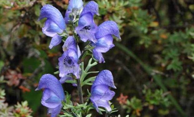 1.短柄乌头,多年生草本,高50-70cm。块根直立,纺锤状圆柱形,长5-8cm,外皮棕黄色。茎直立,疏生反曲的短柔毛。叶互生,掌状3深裂,裂片又2-3深裂,再作深浅不等的细裂,最终小裂片线状披针形或线形,两面几无毛。茎下部叶具长柄,开花时枯萎,中部以上叶较密集,有短柄。总状花序顶生,花序轴被反曲短柔毛;花萼片5,蓝紫色,花瓣状,上萼片膨大呈帽状,高约2.5cm;花瓣一对,有长爪,距短;雄蕊多数,不等长,花丝疏生短毛;子房3-5个,密被直而伸展的黄色长柔毛。蓇葖果3-5个,种子多数。花期8-9月。果期9-10月。