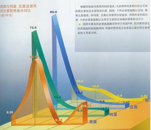 从上图可以看到:燕窝脂肪含量(0.35)最低,是银耳(1.4)的1/4、豆腐(4.8)的1/14、鸡蛋(6.4)的1/18;但燕窝的必需氨基酸总和(18.64)最高,是银耳(2.22)的8.3倍、豆腐(3.47)的5.4倍、鸡蛋(4.61)的4倍。必需氨基酸必须从食物中获得,人体不能合成。根据实验室对燕窝的初步鉴定,大多数研究者都已经认可纯燕窝主要包含水溶性蛋白质、脂肪、8种必需氨基酸以及钠、碘等元素物质。和鸡蛋、豆腐以及银耳比较起来,燕窝所含的蛋白质、8种必需氨基酸以及其他元素的含量确实都要高出不少。图例中银耳的必需氨基酸总和中只包括6种,因为银耳缺乏异亮氨酸和亮氨酸两种。