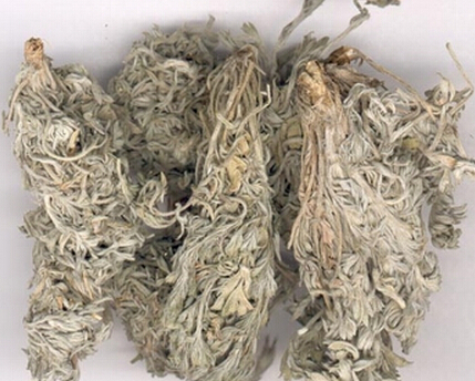 【性状】干燥的幼苗多揉成团状,灰绿色,全体密被白毛,绵软如绒。茎细小,长6~10厘米,多弯曲或已折断;分枝细,基部较粗,直径1.5毫米,去掉表面的白毛后,可见明显的纵纹。完整的叶多有柄,与细茎相连,叶片分裂成线状。有特异的香气,味微苦。以质嫩、绵软、灰绿色、香气浓者为佳。