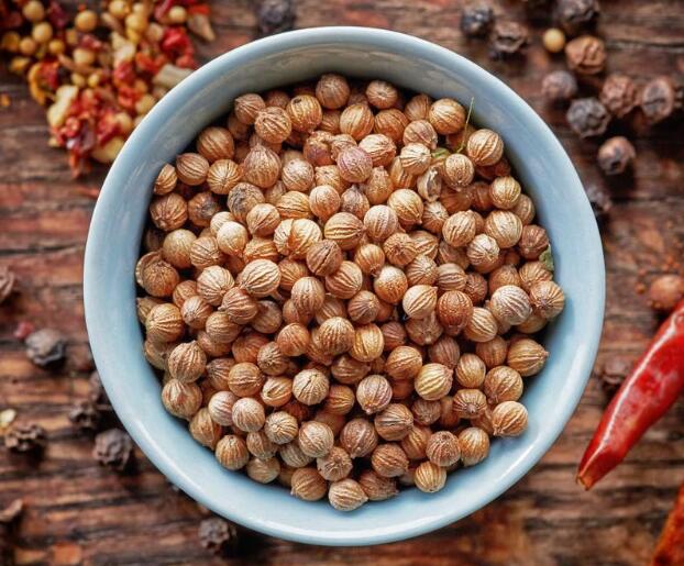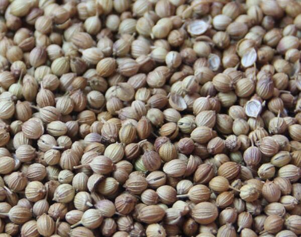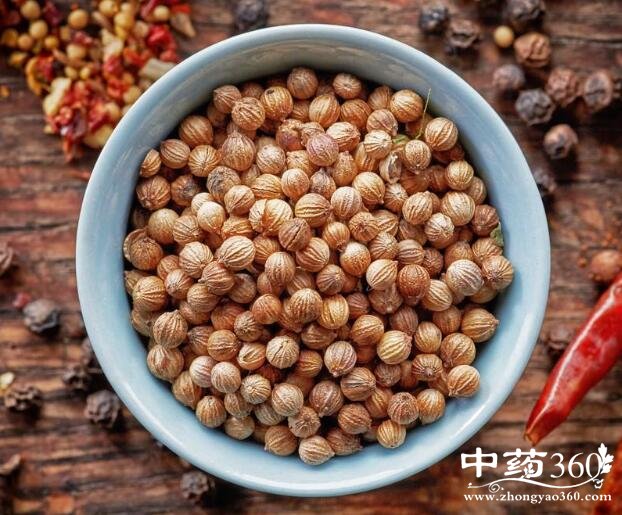 芫荽子,是指伞形科植物芫荽的果实,别名胡荽子,双悬果呈圆球形,直径3~5mm,表面淡黄棕色至黄棕色,较粗糙,顶端可见极短的柱头残迹及5个萼齿残痕,有不甚明显而呈波浪形弯曲的初生棱脊10条及较为明显而纵直的次生棱脊10条,主棱脊与次生棱脊相间排列,有时可见长约1.5cm的小果柄或果柄痕。果实较坚硬。气香,味微辣。有发表、透疹、开胃功能。用于感冒鼻塞,痘疹透发不畅,饮食乏味,齿痛。