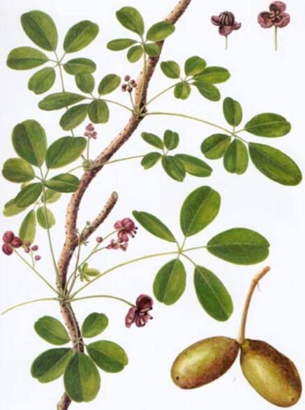 【植物形态】落叶木质藤本,茎、枝均无毛。掌状复叶,通常3~5叶簇生于枝端,或互生,小叶5,倒卵形或长倒卵形,顶端钝圆、微凹或具短尖,基部宽楔形或圆形,全缘。总状花序腋生;花单性;雄花生于上部,雄蕊6枚;雌花花被片紫红色,具6个退化雄蕊,心皮分离,3~12。果实肉质,长卵形,成熟后沿腹缝线开裂;种子多数,卵形,黑色。花期4~5月,果实成熟期8月。