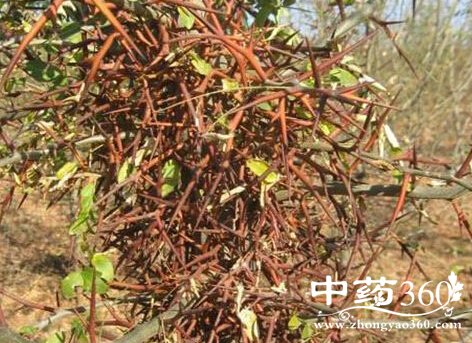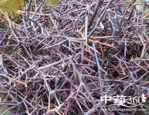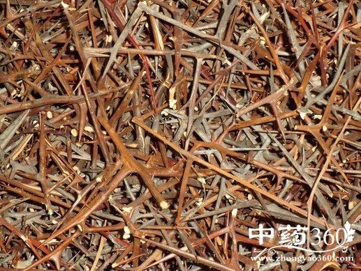 又名圪针,多斜切片,表面铅灰色或黑色,皮孔圆形,棕色,中央具一纵线,茎分枝处具一对黑色托叶刺,刺细长尖锐,直或略弯曲;断面皮部极窄,木部呈木质化,髓部为灰褐色。