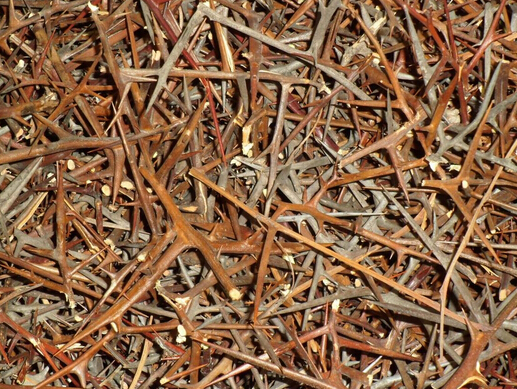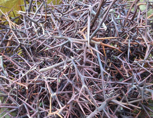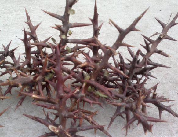 完整的棘刺有多数分枝,主刺圆柱形,长5~15厘米,基部粗约8~12毫米,末端尖锐,分枝刺一般长1.5~7厘米,有时再分歧成小刺。表面棕紫色,尖部红棕色,光滑或有细皱纹;质坚硬,难折断。折断后木质部黄白色,中心为淡灰棕色而疏松的髓部。