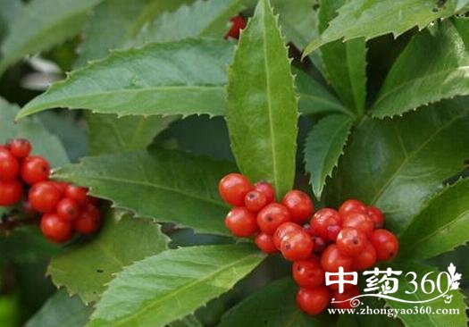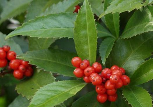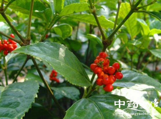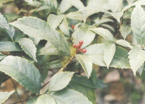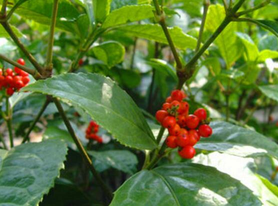 植物草珊瑚Sarcandra glabra(Thunb.)Makai [Chloranthus glaber(Thunb.)Makino]常绿半灌木,高50-150cm。茎数枝丛生,绿色,节部明显膨大。叶对生;叶柄长0.5-1.5cm,基部合生成鞘状;托叶钻形;叶片革质,椭圆形至卵状披针形,长6-17cm,宽2-6cm,先端渐尖,基部楔形,边缘具粗锐锯齿,齿尖有一腺体;主脉明显,侧脉在两面隆起。穗状花序顶生,分枝,连总花梗长1.5-4cm;苞片三角形;花黄绿色;雄蕊1,肉质,圆柱状,花药2室,生于药隔上部两侧;雌蕊1,由1心皮组成;子房球形或卵形,无花柱,柱头近头状。核果小球形,熟时亮红色。花期6-7月,果期8-10月。