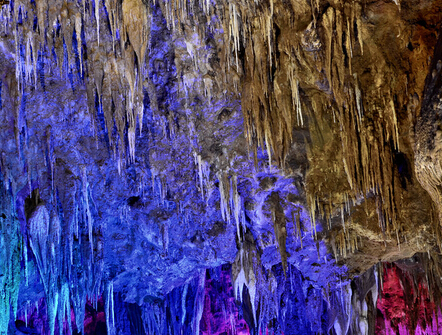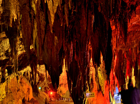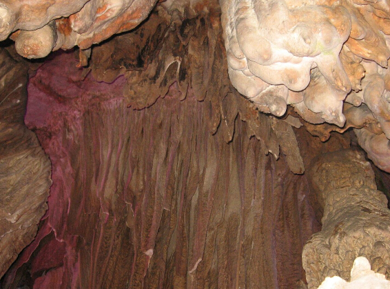 多少万年过去了,这些沉积物越续越长。从洞顶垂下的沉积物像乳头般地倒挂下来,人们叫它石钟乳;从洞底向上长的沉积物,犹如一根根破土而出的竹笋,叫石笋。石钟乳和石笋如果连了起来,就成为一根顶天立地的柱子,叫石柱。一根根石柱连接起来,酷似舞台上的帷幕,叫作石幔。同时,洞顶、洞壁、洞底还会附着不同形态的沉积物,叫石花。这些千姿百态的沉积物,构成了各种各样、瑰丽神奇的景物,琳琅满目,变幻迷离,把溶洞装点得如传说中的地下龙宫一般。