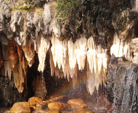 当溶洞形成之后,不但洞底有流水,洞顶也有水顺着岩层裂隙向下渗漏。这种从洞顶下渗的水,是沿着很细的石缝向下流动的,所以水流缓慢细小,基本上都是一滴一滴地渗落下来,这些水里含有从石灰岩中溶蚀出来的碳酸氢钙。水珠在洞顶都会停留一段时间才落下来,在这段时间里,随着水分的蒸发,一部分碳酸氢钙又会变成碳酸钙沉积下来,粘附在洞顶的岩石上。落到同底的水滴,也会在洞底岩石上留下碳酸钙沉积物。每滴水留下的碳酸钙沉积物是很少的,所以沉积物增长的速度十分缓慢。