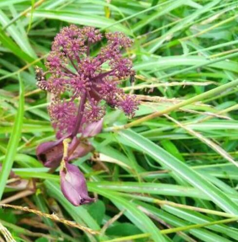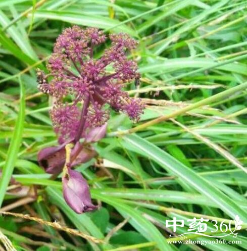 紫花前胡 多年生草本,高1-2m。根圆锥形,常数支根,表面黄褐色至棕褐色。茎直立,圆柱形,具浅纵沟纹,光滑,紫色,上部分枝被柔毛。根生叶和茎生叶有长柄,柄长13-36cm,基部膨大成圆形的紫色叶鞘,抱茎外,面无毛;叶片三角形至卵圆形,坚纸质,长10-25cm,一回三全裂或片和顶端叶片有基部联合,沿叶轴呈翅状延长,侧方裂片和顶端叶片有基部联合,沿叶轴呈翅状延长,侧方裂片和顶凋叶片有基部联合,沿叶轴叶翅状延长,翅边缘有锯齿;末回裂片卵形或长圆状披针形,长5-15cm,宽2-5cm,先端锐尖,边缘有白色软骨质锯齿,齿端有尖头,上面深绿色,脉上有短糙毛,下面绿白色,主脉常带紫色,无毛;茎上部叶简化成囊状膨大的紫色叶鞘。复伞形花序顶生和侧生,花序梗长3-8cm,有柔毛;伞辐10-22,长2-4cm;总苞片1-3,卵圆形,阔鞘状,宿存,反折,紫色;小总苞片3-8,线形至披针形,无毛;伞辐及花柄有毛;花深紫色;萼齿明显,线状锥形或三角状锥形;花瓣倒卵形或椭圆状披针形,先端通常不内折成凹头状;花药暗紫色。果实长圆形至卵状圆形,长4-7mm,宽3-5mm,无毛,背棱线形隆起,尖锐,侧棱有较厚的狭翅,与果体近等宽,棱槽内有油管1-3,合生面有油管4-7mm,宽3-5mm,无毛,背棱线形隆起,尖锐,侧棱有较厚的狭翅,与果体近等宽,棱槽内有油管1-3,合生面有油管4-6,胚乳腹面有油管4-6,胚乳腹面凹入。花期8-9月,果期9-11月。