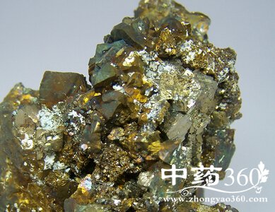 【性状】本品晶形多为立方体,集合体呈致密块状。表面亮淡黄色,有金属光 泽;有的黄棕色或棕褐色,无金属光泽。具条纹,条痕绿黑色或棕红色。体重,质坚硬 或稍脆,易砸碎。断面黄白色,有金属光泽;或断面棕褐色,可见银白色亮星。
