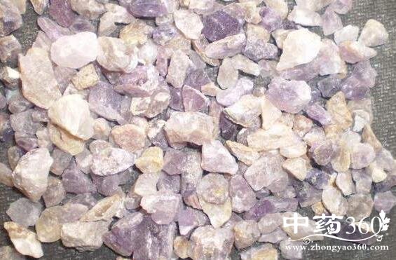 药材性状】不规则的多角形块状,大小不一。表面紫色、淡紫色或浅绿色。色泽深浅不匀,常有裂纹,具玻璃样光泽,半透明。质坚硬而脆,易砸碎,多从棱角处裂破,断面棱角锋利。气微,味淡。