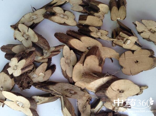 【药材性状】方柱形,四棱钝圆,长短不一,直径0.5~1.5厘米。表面紫棕色或暗紫色,四面有纵沟及细纵纹,节部稍膨大,有对生的枝痕和叶痕。体轻,质硬,断面裂片状。切片厚2—5毫米,常呈斜长方形,木质部黄白色,射线细密,呈放射状,髓部白色,疏松或脱落。气微香,味淡。