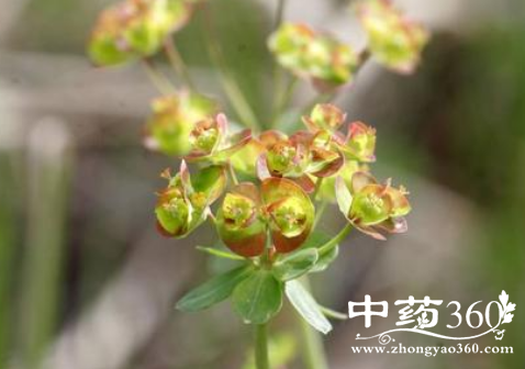 多年生草本,高20~40厘米,全株含乳汁。茎直立,多分枝。叶密生;通常无柄;叶片线形、披针状线形、线状倒披针形乃至披针形,长1~6厘米,宽1~4毫米,先端钝,基部渐狭,全缘;营养枝上的叶丛生于上方,条形,长1.5~3厘米。杯状聚伞花序顶生,排列成伞形;叶状苞片5,轮生,披针形或长圆状卵形;苞叶绿黄色,心状卵形或肾形;花单性,无花被;多数雄花和1枚雌花同生于杯状总苞内,总苞具肾形腺体;雄花仅有雄蕊1;雌花位于花序中央,仅有雌蕊1。蒴果卵圆形,平滑无毛。种子卵圆形,长约1.5毫米。花期5~6月。果期6~7月。