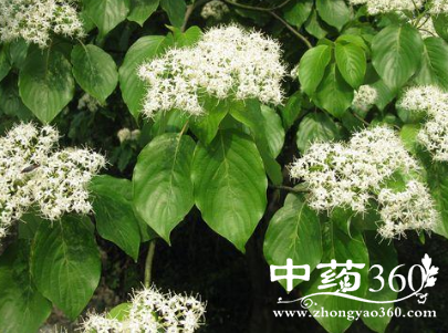 灯台树:又名瑞木。落叶乔木,高6-15m。树皮暗灰色;枝条紫红色,是没有毛的。叶互生;叶柄长26.5厘米;叶片宽卵形或宽椭圆形,长613厘米,宽3.5-9厘米,先端渐尖,基部圆形,上面深绿色,下面灰绿色,疏生贴伏的柔毛;侧脉67对。伞房状聚伞花序顶生,稍被贴伏的短柔毛;花小,白色;萼齿三角形;花瓣4,长披针形;雄蕊4,伸出,长4-5毫米,是没有毛的;子房下位,倒卵圆形,密被灰色贴伏的短柔毛。核果球形,紫红色至蓝黑色,直径6-7毫米。花期5-6月,果期7-8月。