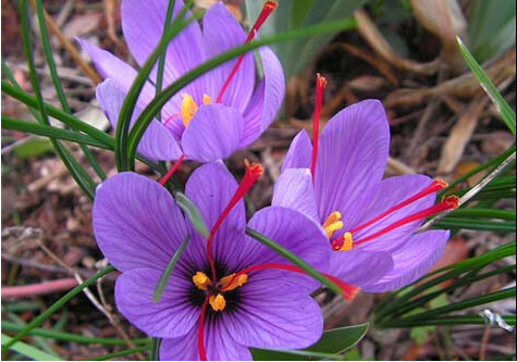 【注】如何鉴别番红花的真伪优劣:番红花由众多扁平的柱头压集而成,柱头红棕色,顶端较宽大,向下渐细,在放大镜下顶端边缘为不整齐的齿状,并有绒毛状突起。入水浸泡,柱头膨胀呈长喇叭状,水被染成黄色,水面不应有油状物漂浮,水不显红色,用棒搅动不易碎断,否则是伪品。番红花以身干、身长,花丝少,色紫红,味辛凉者为佳。