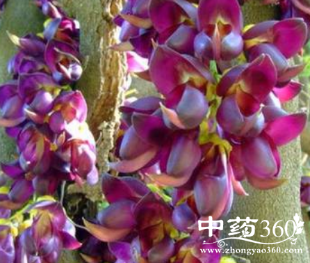【原形态】常绿木质藤本;粗达30cm。茎棕色或黄棕色,粗糙;小枝纤细,淡绿色,光滑无毛。复叶互生,小叶3枚;顶端小叶卵形或长方卵形,长7~12cm,宽5~7cm,先端尖尾状,基部阔楔形;两侧小叶长方卵形,先端尖尾状,基部斜楔形或圆形,小叶均全缘,绿色无毛。总状花序,花大,下垂;花萼外被浓密绒毛,钟裂,裂片钝圆或尖锐;花冠深紫色或紫红色;雄蕊10枚,二体;子房有锈色长硬毛。荚果扁平,木质,密被金黄色粗毛,长30~60cm,宽2.8~3.5cm。种子扁,近圆形,棕色。