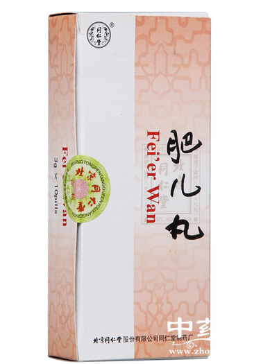 肥儿丸具有健胃消积,驱虫的功效,主要成份是肉豆蔻(煨)、木香、六神曲(炒)、麦芽(炒)、胡黄连、槟榔、使君子仁。肥儿丸方中,木通、淡竹叶、生地清心泻火,柴胡疏肝平肝除热,神曲、麦芽、白豆蔻、木香理气健脾、和胃消积,使君子、槟榔、芜荑杀虫消积,胡黄连、银柴胡、水仙子清热除疳化积,甘草调和诸药。诸药配伍,共奏清心肝、健脾和胃、杀虫消积之功,切中病机,消除厌食。