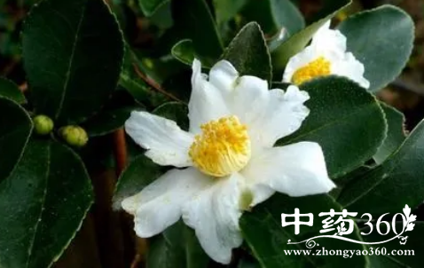 【原形态】常绿灌木,全体与茶相似,惟枝干较粗大。叶长椭圆形,长10~15厘米,宽5~7厘米,锯齿缘。花腋生,白色,比茶花略大;萼片5;花瓣5;雄蕊多数;子房上位;花梗长。蒴果扁圆形。花期秋季。