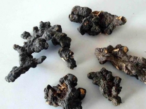 【性状】略呈圆球形或不规则的长圆形,大小不一,直径约0.7~3厘米。黄棕色或深棕色,表面粗糙,凹凸不平,外被一层粉状物。质坚硬,不易砸碎,断面黄白色,有金属光泽,与自然铜相似,有的断面中央呈黄白色,有金属光泽(黄铁矿),边缘呈暗棕色或深黄棕色,最外层则为黄棕色,粉质(褐铁矿)。气微,味淡。