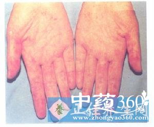 ③颗粒型,此病例为颗粒型,颗粒型红斑大多为原位癌或已经突破基底膜的早期浸润癌,只有少数上皮异常增生,这类型的癌可以面积较大,也有的表现为多中心性生长,颗粒型形成的机制,是上皮钉突增大处的表面形成凹陷,而高突的结缔组织乳头形成红色颗粒,本病易与扁平苔藓,白斑相混淆,组织病理检查是临床诊断的重要依据,甲苯胺蓝染色是一种简单,快速的检查方法,反复染色阳性区取活检标本,更具准确性,红斑是少见的癌前病变,临床上应提高警惕。