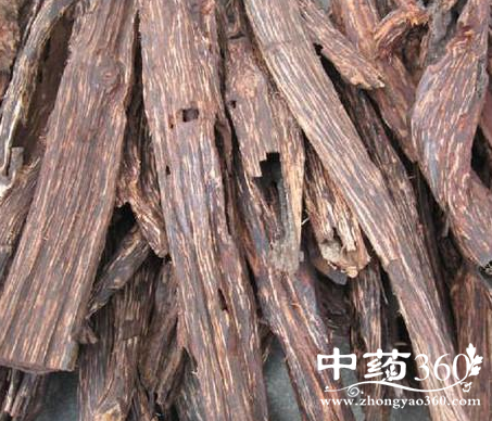 【药材】干燥的根部心材,呈条块状。表面红褐色至棕紫色,有刨削之刀痕,光滑有光泽,并有纵长线纹。如劈裂之,断面粗糙,强木质纤维性,纹理细而质坚硬;气香味淡稍苦,烧之香气浓郁。以红褐色、结实、烧之有浓郁香气,表面无黄白色外皮者为佳。