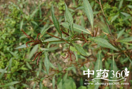 本品全株较光滑。主根明显,长圆锥形多分枝。茎直径0.2至0.8厘米,茎下部节上多须状根;上部多分枝,有棱角约5条,暗紫色或棕绿色,易折断,断面灰白色,中空。单叶互生,多皱缩,完整者展平后呈披针形,全缘,先端渐尖,基部渐狭,长4-7厘米,宽12厘米。花12朵,腋生,无梗。花萼、花瓣均4裂,萼宿存,花瓣椭圆形,先端钝圆。蒴果条状四棱形,直立或弯曲,紫红色,先端具宿萼。种子细小,光滑,棕黄色。气微,味咸,微味道较苦。