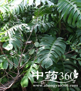 【原形态】常绿本质攀援藤本,长达8米。茎绿色,粗大,节处生根。叶大,长圆形,长40~50厘米,宽30~35厘米,羽状深裂通常几达中脉。肉穗花序无柄,圆柱形,长约20厘米,外托一白色大型佛焰苞片,苞片常脱落。